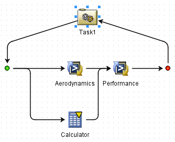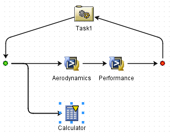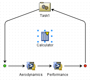 Isight places the Calculator component on a parallel simulation process flow under the Aerodynamics simulation process flow as shown below: