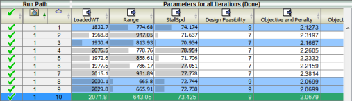 From the History tab, you can see that the ApproxLoop component obtained good solutions with respect to the objectives (minimizing the loaded weight and stall speed, and maximizing the range). Many of the bounded variables reached their lower or upper bounds, meaning that the solution has been constrained by the allowed variability of the inputs. The starting point for the analysis had the following initial values: