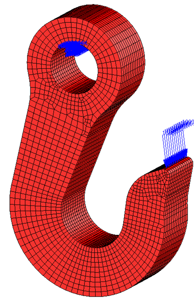 The model of the hook for static analysis is stressed by the forces of a cable. The crane hook is supported by the upper bore hole. To keep the model simple, no other contacts or swinging motions in the bore hole are taken into account. In the modal analysis, the first 5 eigenvalues are to be considered.