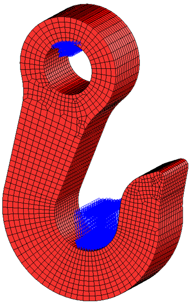 About the ModelThe component optimized in this example is a simple model of a crane hook. The model is generated by extrusion of a 2D contour into the z-direction. The hexahedral mesh is also generated by extrusion.