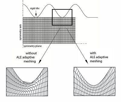 Arbitrary Lagrangian-Eulerian (ALE) adaptive meshing provides control of mesh distortion. ALE adaptive meshing uses a single mesh definition that is gradually smoothed within analysis steps. ALE adaptive meshing is available for limited applications in Abaqus/Standard and is more generally applicable in Abaqus/Explicit. The term ALE implies a broad range of analysis approaches, from purely Lagrangian analysis, in which the node motion corresponds to material motion, to purely Eulerian analysis, in which the nodes remain fixed in space and material “flows” through the elements. Typically ALE analyses use an approach between these two extremes. The ALE feature is distinct from the Eulerian analysis capability in Abaqus/Explicit, which is described in Eulerian Analysis.