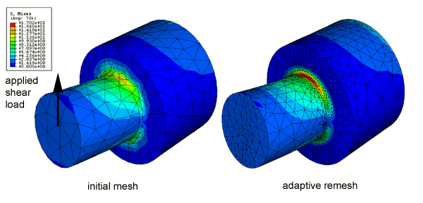 Adaptive remeshing is typically used for accuracy control, although it can also be used for distortion control in some situations. The adaptive remeshing process involves the iterative generation of multiple dissimilar meshes to determine a single, optimized mesh that is used throughout an analysis. Adaptive remeshing is available only for Abaqus/Standard analyses submitted from Abaqus/CAE. The goal of adaptive remeshing is to obtain a solution that satisfies mesh discretization error indicator targets that you set, while minimizing the number of elements and, hence, the cost of your analysis. You can use adaptive remeshing to obtain a mesh that provides a balance between solution cost and desired accuracy. Figure 2 illustrates a case where adaptive remeshing improves the quality of the stress result around a fillet with targeted mesh refinement.