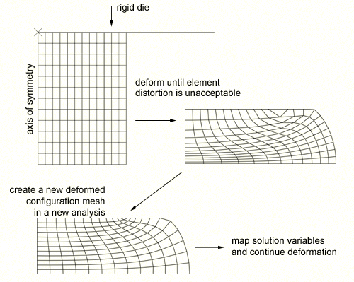 Mesh replacement, or rezoning, involves the creation of multiple Abaqus jobs, each of which represents the configuration of the model in distinct, sequential periods of the simulation history. You use mesh replacement when a single mesh cannot be effective for the duration of a simulation. Each mesh subsequent to the initial configuration reflects a solution-dependent deformed configuration of the model. Therefore, analyses that use mesh replacement are sequentially dependent, and Abaqus uses mesh-to-mesh solution mapping to propagate solution variables from one analysis to the next. In contrast to adaptive remeshing, each mesh replacement job represents a component of the overall analysis history—no single mesh and no single analysis job represent your entire analysis. See Mesh-to-Mesh Solution Mapping for details.