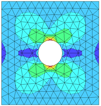 shows the stress result for a simple loading of a plate with a hole.