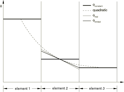 Once the flux-limited linear distributions are determined for all elements in the old mesh, these distributions are integrated over each new element. The new value of the variable is found by dividing the value of each integral by the new element volume. (See Figure 3 for a first-order example of this calculation.) ![]() Input File Usage Use the following option to specify that the second-order advection method should be used to remap element variables: ADAPTIVE MESH CONTROLS, NAME=name, ADVECTION=SECOND ORDER Abaqus/CAE Usage Step module: Name: name, toggle on Second order: First-Order AdvectionFirst-order advection is simple and computationally efficient; however, it tends to diffuse sharp gradients over time, especially in transient dynamic analyses or other problems that require fairly frequent adaptive meshing. Therefore, this technique should be used only as a computationally efficient alternative for quasi-static simulations that do not require frequent adaptive meshing. Figure 3 illustrates the first-order method for a portion of a one-dimensional mesh. An element variable, , is remapped from the old mesh to the new mesh by first assuming a constant value of the variable for each old element. These values are then integrated over each new element. The new value of the variable is found by dividing the value of each integral by the new element volume. Input File Usage Use the following option to specify that the first-order advection method should be used to remap element variables: ADAPTIVE MESH CONTROLS, NAME=name, ADVECTION=FIRST ORDER Abaqus/CAE Usage Step module: Name: name, toggle on First order: Momentum AdvectionNodal velocities are computed on a new mesh by first advecting momentum, then using the mass distribution on the new mesh to calculate the velocity field. Advecting momentum directly ensures that momentum is conserved properly in the adaptive mesh domain during remapping. Two methods are available for advecting momentum: the default element center projection method and the half-index shift method (Benson, 1992). Both methods are applicable for all adaptive mesh applications. Element Center Projection MethodThe element center projection method is the default method used to advect momentum and requires the fewest numerical operations. The element momentum is calculated first for the old mesh based on the mass and velocity of the element nodes. The element momentum is then advected from the old mesh to the new mesh by the same first- or second-order algorithms used for advecting element variables. Finally, the element momentum on the new mesh is assembled at the nodes using a projection. The element center projection method requires the advection of only two or three extra variables in two dimensions or three dimensions, respectively. Input File Usage Use the following option to request the most computationally efficient momentum advection method: ADAPTIVE MESH CONTROLS, NAME=name, MOMENTUM ADVECTION=ELEMENT CENTER PROJECTION Abaqus/CAE Usage Step module: Name: name, Momentum advection: Element center projection: Half-Index Shift MethodThe half-index shift method is computationally more intensive than the element center projection method, but it may result in less wave dispersion for some problems. This method first shifts each of the nodal momentum variables from the nodes surrounding an element to the element center. The shifted momentum variables are then advected from the old mesh to the new mesh by the same first- or second-order algorithms used for advecting element variables, providing momentum variables at the center of the new elements. Finally, the momentum variables at the element centers in the new mesh are shifted back to the nodes. The half-index shift method requires the advection of 8 or 24 extra variables in two or three dimensions, respectively, which can increase the cost of each advection sweep significantly. Input File Usage Use the following option to specify that the half-index shift method should be used for momentum advection: ADAPTIVE MESH CONTROLS, NAME=name, MOMENTUM ADVECTION=HALF INDEX SHIFT Abaqus/CAE Usage Step module: Name: name, Momentum advection: Half-index shift: References