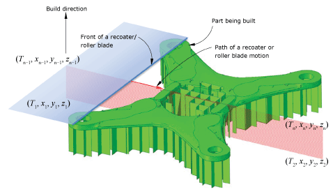layer of raw material to fuse it with the previously laid layer underneath (see Figure 1). The layer-upon-layer raw material deposition is simulated by
