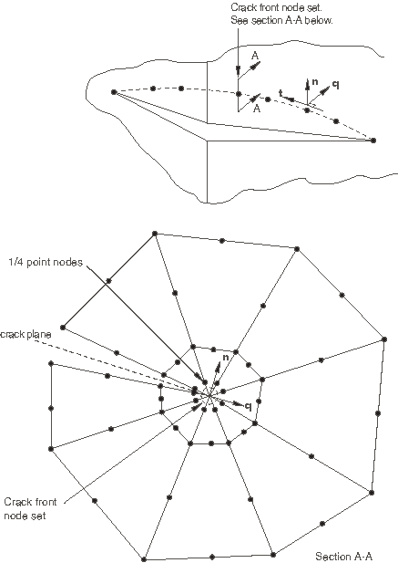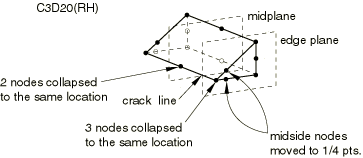 wedges in the mesh that is included in the contour integral regions. When the elements around the crack tip are generated in Abaqus/CAE, wedge elements are converted to collapsed hexahedral elements. The elements within