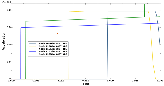 Figure 30. The time history of acceleration for the five sleds with different