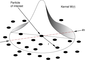 An illustration of the kernel function is shown in Figure 2. The smoothing length, h, determines how many neighboring particles