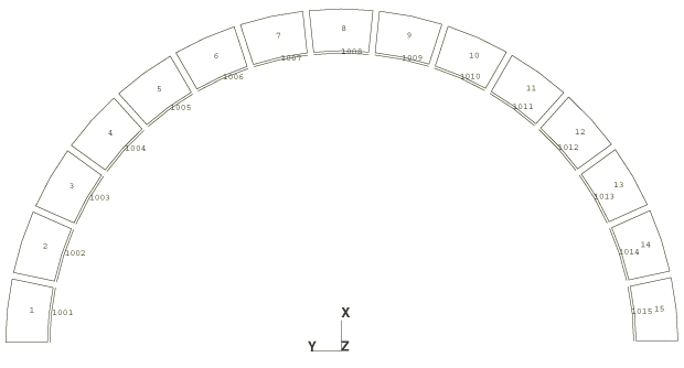 Figure 1 shows the finite element mesh using a single layer of 15 ACAX8 elements, with ASI3A coupling elements on the inner surface and the impedance applied to the outer faces of the ACAX8 elements. Uniform radial velocities are applied to the inner surface transforming the spherical coordinates to a local coordinate system before specifying the magnitudes. The dimensions and acoustic properties of this problem are chosen to facilitate comparison with the analytical value of the impedance, With and , , and the acoustic wave number is equal to the analysis frequency in Hertz, Moreover, if the imposed normal velocity , the value of the pressure variable on the inner boundary will equal the value for the impedance, . This normal velocity is imposed using a boundary condition in conjunction with a transformed coordinate system, as shown in acousticimpsphere_acax8_bayliss.inp. Since the degrees of freedom representing the tangential velocity components have no stiffness associated with them, they must be constrained to prevent solver problems.