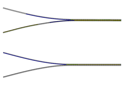 When connector elements are used, the problem is modeled only in two dimensions in Abaqus/Standard. Two node-based surfaces are generated: one along the top surface of the 10th layer and