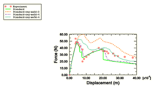 the experimental value and predicts a milder and smoother drop in the reaction force