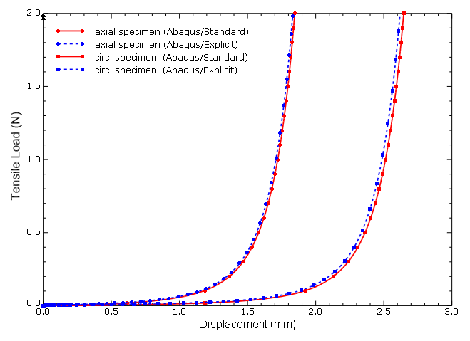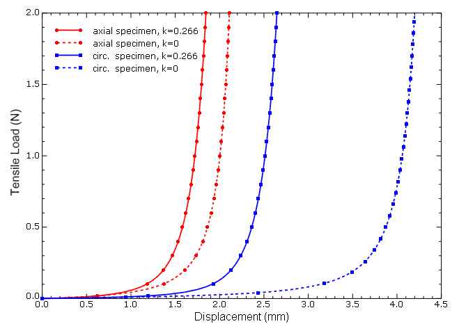 axial specimens. The dashed curves correspond to the simulations with ideally