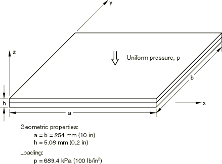 The structure is a two-layer, composite, orthotropic, square plate that is simply supported on its edges. The layers are oriented at 45° with respect to the plate edges. Figure 1 shows the loading and the plate dimensions. Each layer has the following material properties:
