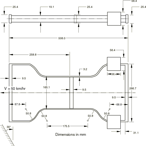 Figure 1 shows the structure, which is a scale model of a typical motor vehicle frame made of steel. The frame is moving forward at a speed of 13.89 m/s (50 km/h—about 31 miles/hour) when it collides against an oblique, rigid wall that is at 30° to its direction of motion. The objective of the analysis is to predict the history of deformation of the frame during the crash event.