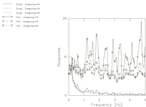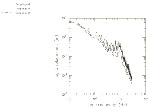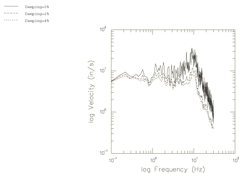 1–10 seconds. Figure 10. Displacement spectra for the frequency range 0.1–30 Hz. Figure 11. Velocity spectra for the frequency range 0.1–30 Hz. Figure 12. Displacement and velocity spectra for the frequency range 0.01–5.0
