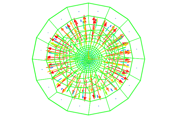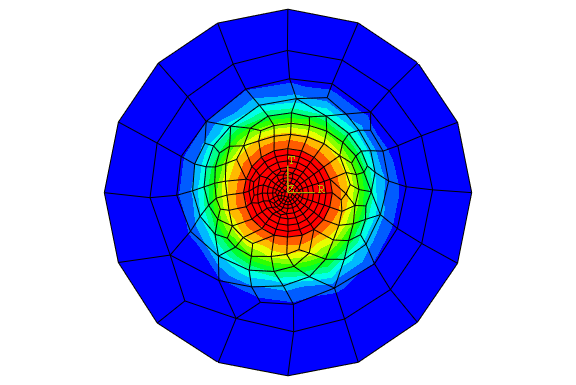 Figure 4 and Figure 5 show the contour plot of pore pressure and a vector plot of the magnitude of the fluid velocity, respectively, at some intermediate time (approximately 5700 seconds) during the analysis. The distribution of pore pressure is approximately axisymmetric, with higher pore pressures closer to the central heat source. The radial gradient in the pore pressure drives the pore fluid flow, resulting in pore fluid velocity vectors that point approximately in the radial direction. The mesh itself is not axisymmetric, which results in small variations in the solution from a purely axisymmetric state.