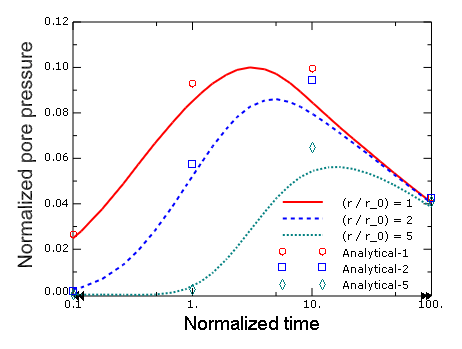 There are two distinct time scales associated with this problem: one for each of the two diffusive mechanisms that are operational. The first time scale is associated with diffusive heat transfer and is given by , where is the radius of the cylindrical heat source, while represents the thermal diffusivity of the surrounding medium and is given by . In the preceding expression, , , and represent the density, specific heat capacity, and conductivity, respectively, of the surrounding medium. In general, the thermal properties used in this expression need to be weighted average quantities based on the volume fraction of the pores. However, such averaging is not necessary in this example as the thermal properties of the soil and the pore fluid are assumed to be the same. The second time scale is associated with diffusive flow of the pore fluid and is given by . In the preceding expression, the quantity represents the consolidation coefficient that is defined as , where is the permeability of the porous medium, and are elastic constants, and is the specific weight of the pore fluid. The choice of the different parameters for the problem is such that the ratio is approximately equal to 2.