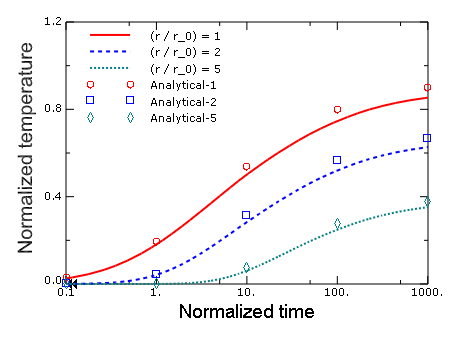 The temperature results suggest that at the surface of the heat source, the temperature approaches with time, while at distances further away from the heat source the temperature increases with time at a slower rate. The results agree well with the analytical results, especially relatively early in the analysis. The mesh used for the simulations is relatively coarse with 2718 elements. The agreement between the finite element predictions and the analytical solutions is much better at all times if the analysis is carried out with a more refined mesh consisting of 9816 elements.