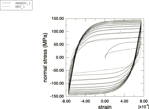 The shape of the first cycle differs from the shape of subsequent cycles, suggesting that the kinematic hardening component is a function of the cycle number. Since the model does not allow for such a dependency, a representative shape must be chosen. The objective in this example is to compare the model predictions with test data over many cycles. The stabilized cycle is, therefore, chosen for calibration. If the model were being used to simulate only one or two load cycles, it would be more appropriate to use the first loading cycle for calibration.
