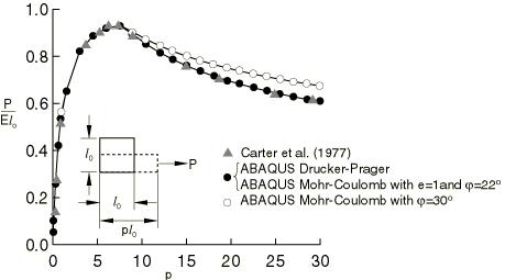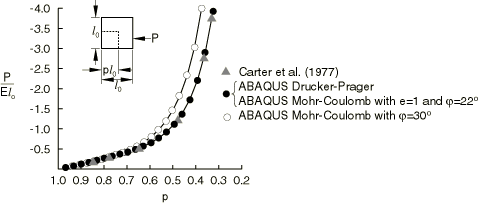 The specimen is initially stress-free and is made of an elastic, perfectly plastic material. The elasticity is linear, with a Young's modulus of 30 MPa and a Poisson's ratio of 0.3. Carter et al. assume that the inelastic response is governed by a Mohr-Coulomb failure surface, defined by the friction angle of the Coulomb line ( 30°) and the material's cohesion (c). They also assume that the cohesion is twice the Young's modulus for the extension test and 10% of the Young's modulus in the compression test. The above problem is solved using the Mohr-Coulomb plasticity model in Abaqus with the friction angle and the dilation angle equal to 30°. However, note that this Abaqus Mohr-Coulomb model is not identical to the classical Mohr-Coulomb model used by Carter because it uses a smooth flow potential.