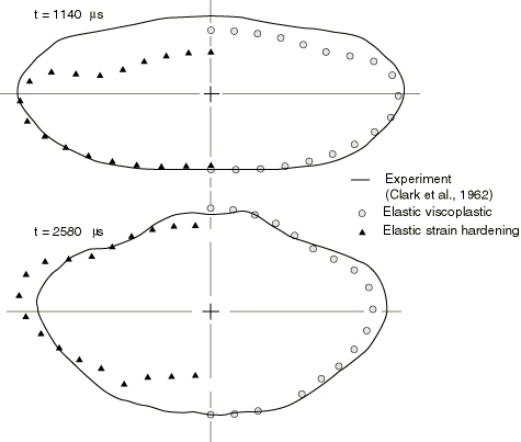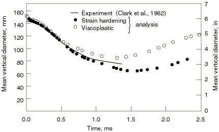 The material is 6061–T6 aluminum alloy at room temperature. Its density is 2672 kg/m3 (2.50 × 10−4 lb s2/in4). Young's modulus is assumed to be 72.4 GPa (10.5 × 106 lb/in2), Poisson's ratio is 0.30, and the static yield stress is 295.1 MPa (42800 lb/in2). Two plasticity models are used: one with no rate dependence, but isotropic strain hardening, with a constant tangent modulus of 542.6 MPa (78700 lb/in2); and the standard elastic, viscoplastic model in Abaqus, with the static response assumed to be perfectly plastic and the yield stress given above. When the stress magnitude exceeds this static yield value, the plastic strain rate is given by