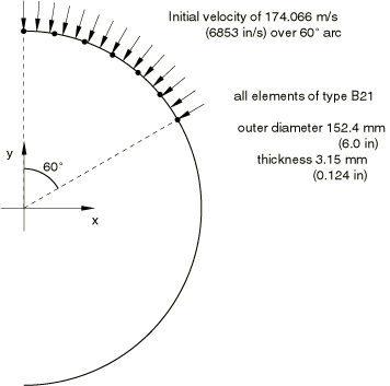 The model is shown in Figure 1. The ring has an outer diameter of 152.4 mm (6 in) and thickness of 3.15 mm (0.124 in). The width of the ring is 30.36 mm (1.195 in). Half of the ring is modeled with 18 equal-sized elements, with symmetry boundary conditions at the ends of the model. B21 (linear interpolation beam for planar motion) elements are used in the Abaqus/Standard analysis; the Abaqus/Explicit analysis is first carried out with beam elements (B21) and then with shell elements (S4R). The cross-section integration (for material nonlinearity) is chosen as a seven-point Simpson rule: this should provide reasonable accuracy for a case like this where only a few cycles of reversal plasticity are expected.