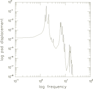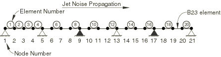 Each span is modeled with four elements of type B23 (cubic beam in a plane), as shown in Figure 1. No mesh convergence studies have been performed; however, the first 15 natural frequencies agree quite well with the exact values given by Olson, so we assume that the mesh is reasonable. The response analysis is based on 1% of critical damping in each mode, as used by Olson.