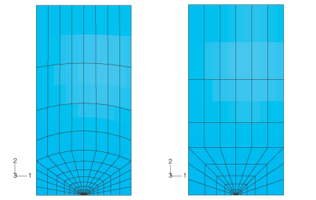 The two focused meshes that are used are shown in Figure 2. Although using elements with curved edges is not recommended in J-integral calculations, the error for this fine a mesh is negligible. The coarser mesh does not contain any curved elements. Due to symmetry, only the top half of the specimen is modeled. In the coarse mesh model there are six rings of elements around the crack tip; thus, J-integral values on at most six contours can be obtained. In the fine mesh model with nine rings of elements around the crack tip, J-integral output can be obtained for nine contours.