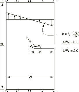 The problem is the case for which Shih et al. (1986) provide results. The example is a single-edged notched specimen, restrained against axial motion at its ends and subjected to a linear temperature variation across its width. The particular geometry studied is cracked halfway through its thickness; the total length of the specimen (2L) is 2.032 m (80 in), and the total width is 508 mm (20 in). The geometry and thermal loading are shown in Figure 1.