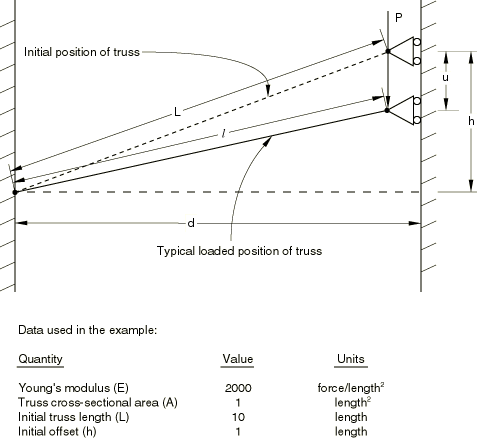 The structure exhibits nonlinear response throughout its deformation, unlike typical “stiff” shell-type structures that often behave in an almost linear fashion until they buckle. Therefore, this type of problem cannot be analyzed effectively with the eigenvalue buckling procedure. However, since an exact solution to the problem is readily developed (see below), the example is a useful illustration of a simple, geometrically nonlinear analysis.