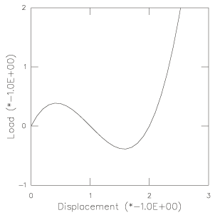 The solution clearly involves an instability, since a nonzero force is required to begin displacing the endpoint of the rod downward, but the force must drop back to zero as the rod becomes horizontal: this horizontal position is one of unstable equilibrium. Since the problem involves only one displacement variable, no bifurcation is possible, so the behavior is quite simple compared to what can happen in systems with many degrees of freedom whose response may involve instabilities. Moreover, the displacement variable is prescribed, so there are, in fact, no unknowns in this problem. To obtain a solution at regular displacement intervals, automatic time incrementation is switched off.