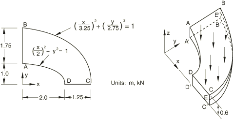 ProductsAbaqus/StandardAbaqus/Explicit Elements testedC3D20 C3D20R C3D10 C3D10HS C3D10M Problem descriptionModel:Thick plate under uniform pressure. Mesh:A coarse and a fine mesh are tested. Material:Linear elastic, Young's modulus = 210 GPa, Poisson's ratio = 0.3, density = 7800 kg/m3. Boundary conditions:0 on face DCD′C′. 0 on face ABA′B′. 0 on face BCB′C′. 0 on line EE′ (E is the midpoint of edge CC′; E′ is the midpoint of edge BB′). Loading:Uniform normal pressure of 1.0 MPa on the upper surface of the plate. Reference solutionThis is a test recommended by the National Agency for Finite Element Methods and Standards (U.K.): Test LE10 from NAFEMS Publication TNSB, Rev. 3, “The Standard NAFEMS Benchmarks,” October 1990. Target solution: Direct stress, 5.38 MPa at point D. Results and discussionThe Abaqus/Standard results are shown in Table 1. The values enclosed in parentheses are percentage differences with respect to the reference solution.