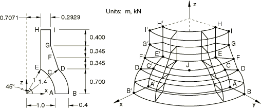 ProductsAbaqus/Standard Elements testedC3D20 C3D20R Problem descriptionMesh:A coarse and a fine mesh are tested. Material:Linear elastic, Young's modulus = 210 GPa, Poisson's ratio = 0.3, coefficient of thermal expansion = 2.3E−4/°C. Boundary conditions:0 on the plane 0. 0 on the plane 0. 0 on the plane 0 and the face HIH′I′. Loading:Linear temperature gradient in the radial and axial directions is given by This is applied using user subroutine UTEMP. Reference solutionThis is a test recommended by the National Agency for Finite Element Methods and Standards (U.K.): Test LE11 from NAFEMS Publication TNSB, Rev. 3, “The Standard NAFEMS Benchmarks,” October 1990. Target solution: Direct stress, = −105 MPa at point A. Results and discussionThe results are shown in the following table. The values enclosed in parentheses are percentage differences with respect to the reference solution.