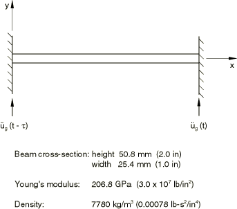 As an illustration we consider a simple model of a bridge whose supports are subjected to seismic excitations. Two cases are analyzed: the first considers identical base excitations at the supports, and the second assumes that the left-end support is subjected to the excitation with a time shift. The forcing function corresponds to the same El Centro N–S earthquake records used in Analysis of a cantilever subject to earthquake motion. The model is a double cantilever lying horizontally along the x-direction (see Figure 1), analyzed with 20 equal-sized B23 elements. A two-second event is studied. Analyses are also performed using the implicit dynamic procedure to provide a basis for comparison of the results obtained by the modal dynamic procedure. The time incrementation scheme is the same as that used in Analysis of a cantilever subject to earthquake motion.