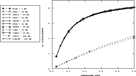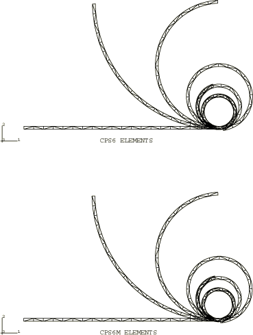 For the continuum elements the solid section thickness and height are chosen to be 100 mm and 147.8 mm, respectively, so that the section moment of inertia is identical to that of the pipe section defined above. The section moment of inertia determines the bending behavior, which is the dominant deformation for both cases since axial deformation is insignificant. We measure the performance of the incompatible mode elements, CPS4I and C3D8I; the second-order elements, CPS8, CPS8R, CPS6, CPS6M, C3D10, C3D10HS, and C3D10M; and the first-order elements, CPS4, CPS4R, C3D8, and C3D8R. The corresponding second-order three-dimensional elements, C3D20 and C3D20R, are not included but can be expected to provide about the same results as the CPS8 and CPS8R elements, respectively. A single layer of elements is used in all the meshes. The reduced-integration, linear elements, CPS4R and C3D8R, when used with enhanced hourglass control give good results that match the results obtained using incompatible mode elements since both are based on an assumed strain formulation. Two mesh types are used for the transverse load case: a coarse mesh of 1 × 10 for the first-order elements and 1 × 5 for the second-order elements and a fine mesh of 1 × 20 for the first-order elements and 1 × 10 for the second-order elements. For the moment load case a 1 × 40 mesh is used with the element types tested (CPS4I, CPS4R, CPS8R, CPS6, CPS6M, and C3D8R). A fine mesh is needed to converge to the correct result; for this loading case a 1 × 20 mesh results in a noticeably stiffer response.