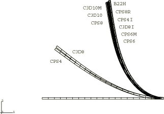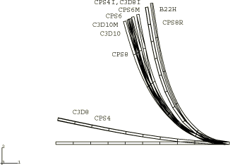 For comparison purposes, reduced-integration linear membrane (M3D4R), shell (S4R), and continuum shell (SC8R) elements are used with enhanced hourglass control for the transverse load and moment load cases with the same meshes as for CPS4R elements. In addition, continuum shell meshes are provided for the transverse load and moment load cases with similar meshes as for C3D8R elements.
