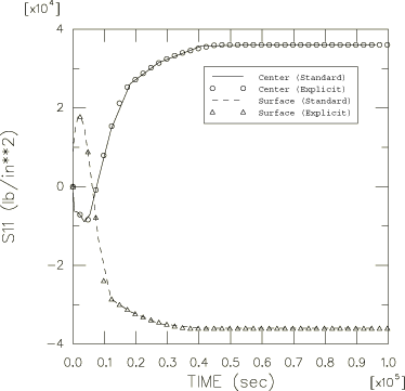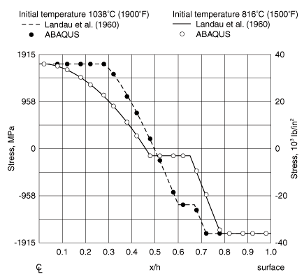 The finite element mesh used in the Abaqus/Standard simulations is shown in Figure 1. Ten elements are used through the half-thickness of the plate. Only one row of elements is needed since the problem is one-dimensional. No mesh convergence studies have been done: it is assumed that this mesh should give reasonably accurate results. This assumption is confirmed by the agreement with the results described by Landau et al. (1960). For the sequential thermal-stress analyses the heat transfer mesh uses elements of type DC2D8 (8-node quadrilaterals) and DC2D4 (4-node quadrilaterals). For the stress analysis the boundary conditions correspond to generalized plane strain in all directions that are normal to the surface of the plate; that is, any straight line that is initially perpendicular to the surface of the plate remains straight and perpendicular to the surface, but the distance between such lines varies as the plate cools. In the sequential thermal-stress analyses this condition is modeled using four element types: axisymmetric elements CAX8R and CAX4I and generalized plane strain elements CPEG4I and CPEG8R. To verify the interpolation technique between dissimilar meshes, the stress analysis using CAX8R elements is driven by the temperature field from the analysis using DC2D4 elements. In the fully coupled Abaqus/Standard simulations CPEG4HT, CPEG8RHT, CAX4T, and CAX4RT elements are used. The generalized plane strain elements have zero relative rotations prescribed between the planes that define the limits of the model in the thickness direction. (This condition is imposed by introducing boundary conditions at the reference node of these elements.) The generalized plane strain condition in the plane of the model is imposed in both models by using a symmetry condition on the left-hand edge of the mesh and an equation constraint to impose equal displacements at all nodes on the right-hand edge of the mesh.