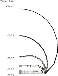 Figure 1. Mesh for pressurized rubber disk. Figure 2. Displaced shapes of pressurized rubber disk,