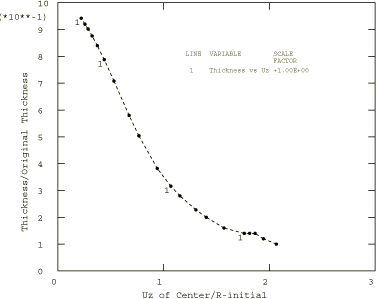 shows a plot of thinning strain at the center of the disc versus the normalized