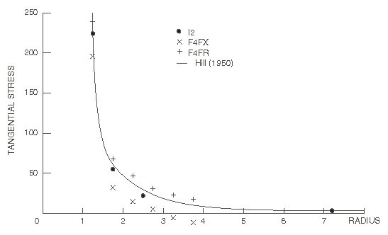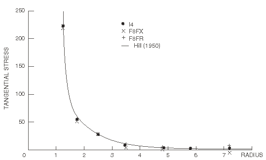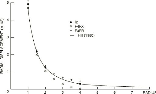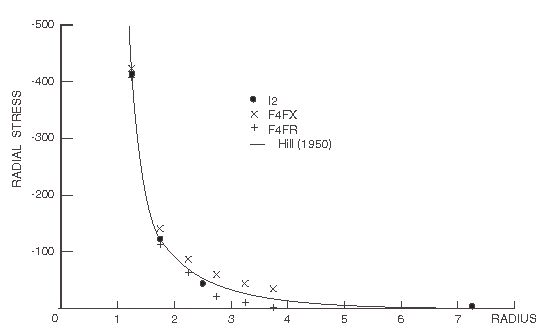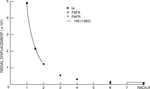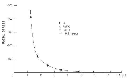 In consistent units the radius of the cavity is 1.0, and an internal pressure of 750 is applied. The material is isotropic, linear elastic, with Young's modulus 107 and Poisson's ratio 0.33.