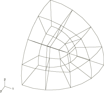 Two coupled finite/infinite element meshes are used. First, we take an F8 mesh and replace the outer layer of finite elements by a layer of CIN3D12R elements. We label this mesh I4, the digit 4 indicating the radius at which the finite and infinite elements are coupled. Second, we use a mesh with a single layer of finite elements between radial values 1 and 2 and coupled to it a layer of CIN3D12R elements. This mesh is labeled I2. To test the use of substructures in problems involving coupled finite/infinite element meshes, the I2 mesh is also solved using substructuring with the entire model treated as a single substructure.