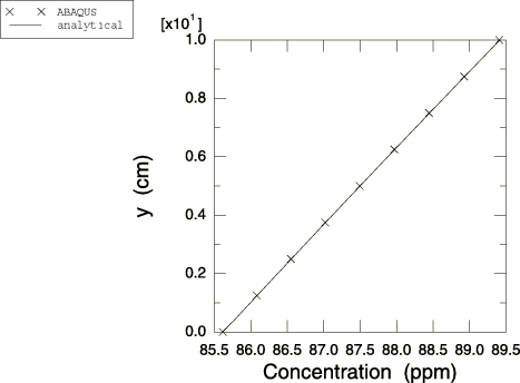 The material properties for mass diffusion were selected to verify the sequentially coupled mass diffusion procedure and are not intended to model true properties of the material. Solubility, s, is defined as unity so that concentration, c, and normalized concentration, , are equivalent. This assumption is acceptable since no material interfaces are present. Diffusivity, D, is specified as 3.6 × 10−6m2/h; temperature dependence of the diffusivity is not accounted for in this example. Stress-assisted diffusion is specified by defining the pressure stress factor, , as