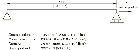 The truss model is shown in Figure 1. The cable is modeled using 13 truss elements of type T2D2 (two-dimensional, 2-node, linear interpolation). A tensile force of 2224 N (500 lb) is first applied to the cable in a static step. In the first increment of this step the model has one singular degree of freedom at each node, because the unstressed cable has no stiffness associated with transverse displacement. As soon as the cable has some tension, it offers stiffness to transverse motion through the initial stress terms. Thus, the user must take care to constrain these singular degrees of freedom initially, and remove the constraints once the tensile stress has been created. Alternatively, very weak springs could be used. In fact, this example is set up so that these temporary constraints are not needed because the cable is aligned exactly parallel to one of the global axis directions. Thus, the stiffness will be initially identically zero in the other global axis direction. Abaqus will recognize this and automatically eliminate those degrees of freedom in the initial increment. In both steps of this analysis, the preload and the eigenvalue extraction, the initial stress effect is obtained by considering geometric nonlinearities.