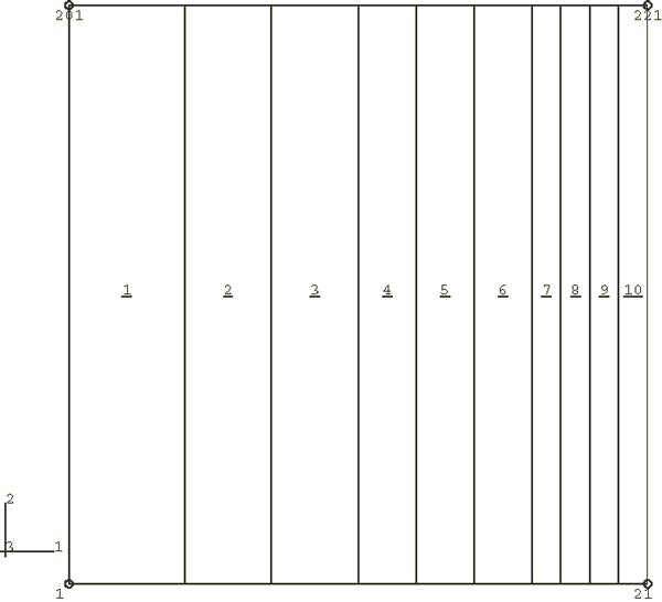 The slab has unit half-thickness. Since the problem is one-dimensional, the slab is modeled with a single row of plane strain continuum elements. In Abaqus/Standard a sequential thermal-stress analysis is performed with two-dimensional, 8-node heat transfer elements, DC2D8, used for the heat transfer analysis and the corresponding 8-node plane strain continuum elements, CPE8R, used for the stress analysis. The mesh is shown in Figure 1. In Abaqus/Explicit a coupled thermal-stress analysis is performed using first-order plane strain elements (CPE3T and CPE4RT) to model the slab. Twenty elements are used along the length of the slab in the Abaqus/Explicit simulation.