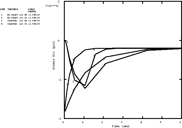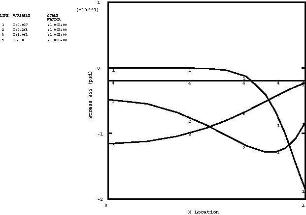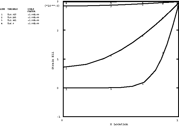 The initial temperature throughout the slab is 0°. The outside face of the slab, at 1, is instantaneously raised to 100°. The mesh (Figure 1) is finer toward 1, where the temperature gradient is expected to be highest. The resulting transient temperature distribution is written to the results file and used as input to the subsequent stress analysis. Plane strain is imposed in the Y-direction by setting 0 on the two faces of the mesh at 0 and 1. Symmetry about 0 is also imposed.