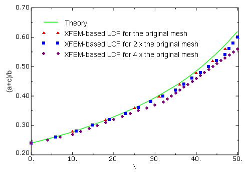 In the low-cycle fatigue analysis, two steps are involved. A static step is used to nucleate a crack at the site of stress concentration prior to the low-cycle fatigue direct cyclic step, in which a cyclic distributed loading with a peak value of 1.25 MPa is specified. Three different mesh discretizations of the same geometry are studied. The second mesh has twice as many elements as the original mesh, while the third mesh has four times as many elements as the original mesh.