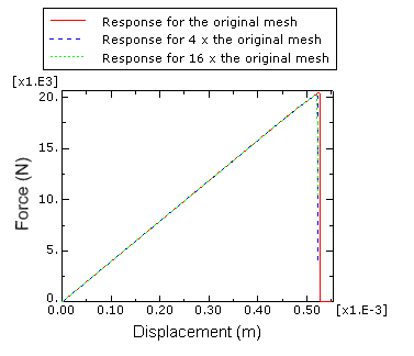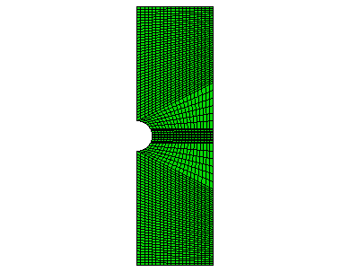 Equal and opposite displacements are applied at both ends in the longitudinal direction. The maximum displacement value is set equal to 0.00055 m. To examine the mesh sensitivity, three different mesh discretizations of the same geometry are studied. Symmetry conditions reduce the specimen to a half model. The original mesh, as depicted in Figure 2, has 2060 plane strain elements. The second mesh has four times as many elements as the original one, while the third mesh has sixteen times as many elements as the original one.