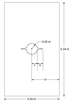 A plate with a circular hole is studied. The specimen, shown in Figure 1, has a length of 0.34 m, a thickness of 0.02 m, a width of 0.2 m, and a hole radius of 0.02 m, under pure Mode I loading. Figure 1 defines the dimensions used to calculate the variation of crack length, : a is the crack length, b is half the specimen width, and c is the hole radius.