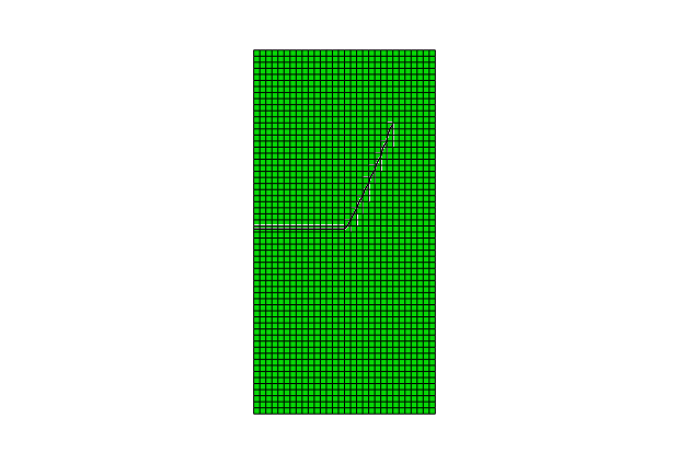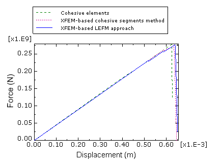 The response of cohesive behavior in the enriched elements in the model is specified. The maximum principal stress failure criterion is selected for damage initiation; and a mixed-mode, energy-based damage evolution law based on a power law criterion is selected for damage propagation. The relevant material data are as follows: MPa, × 103 N/m, × 103 N/m, 42.2× 103 N/m, and . The relevant material data defined above are also used in the model simulated using the XFEM-based LEFM approach.